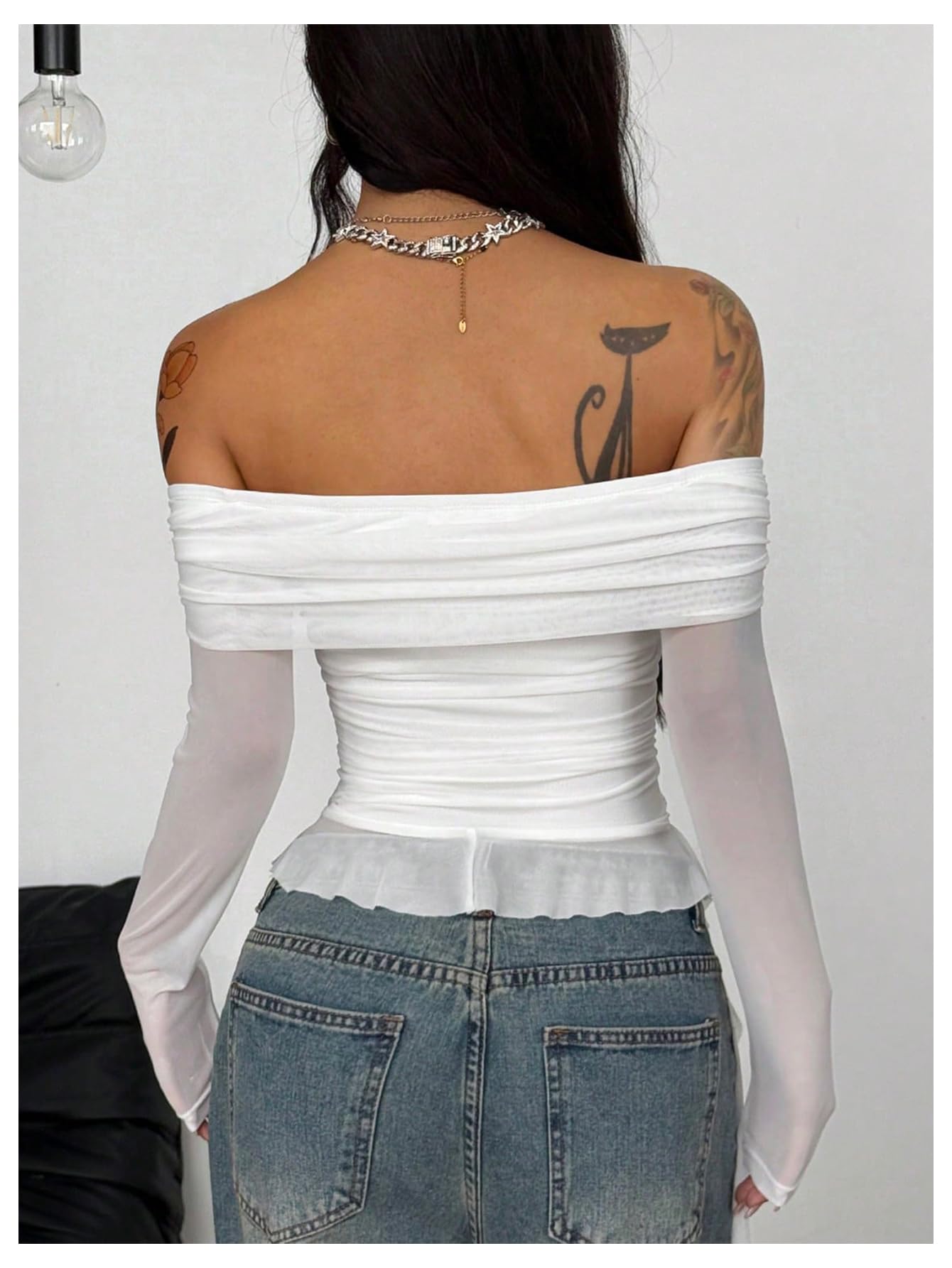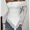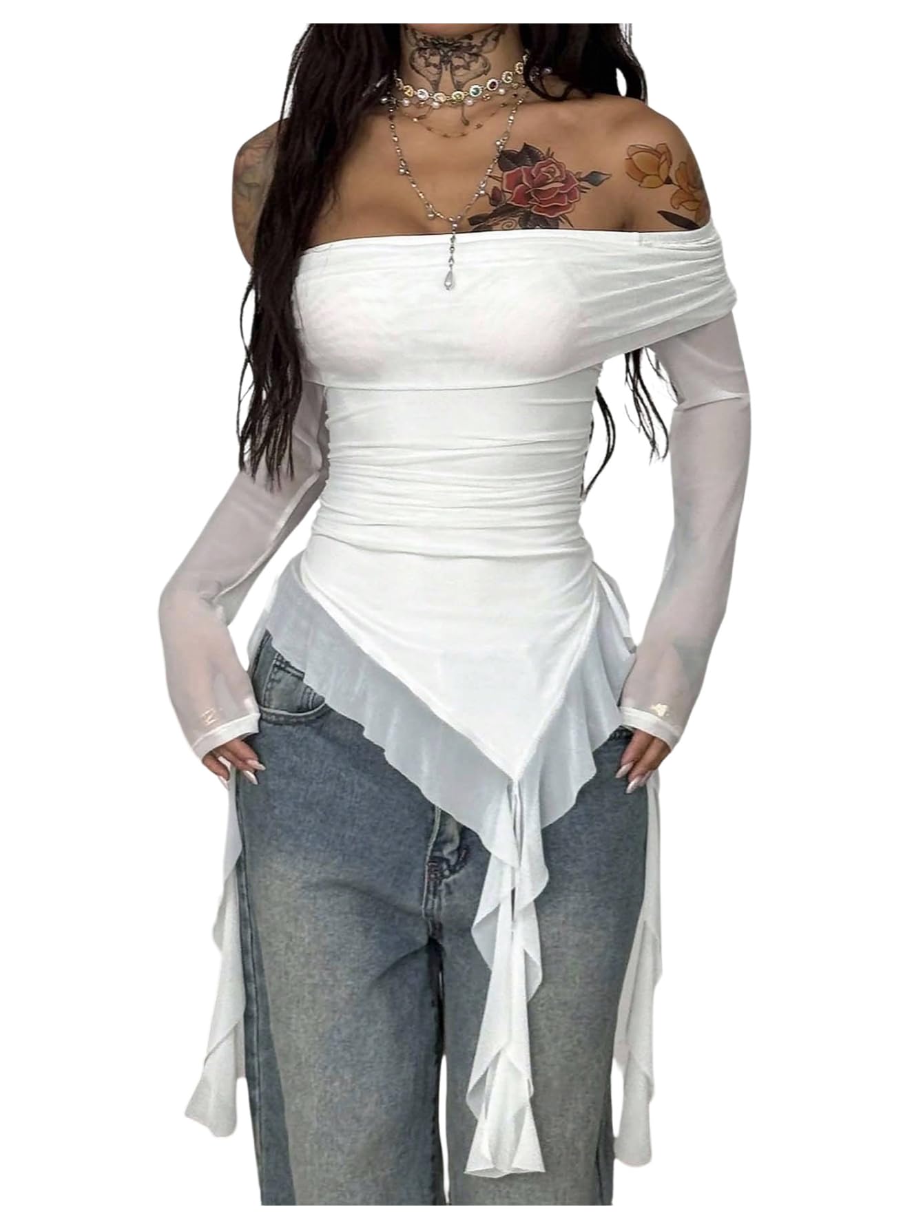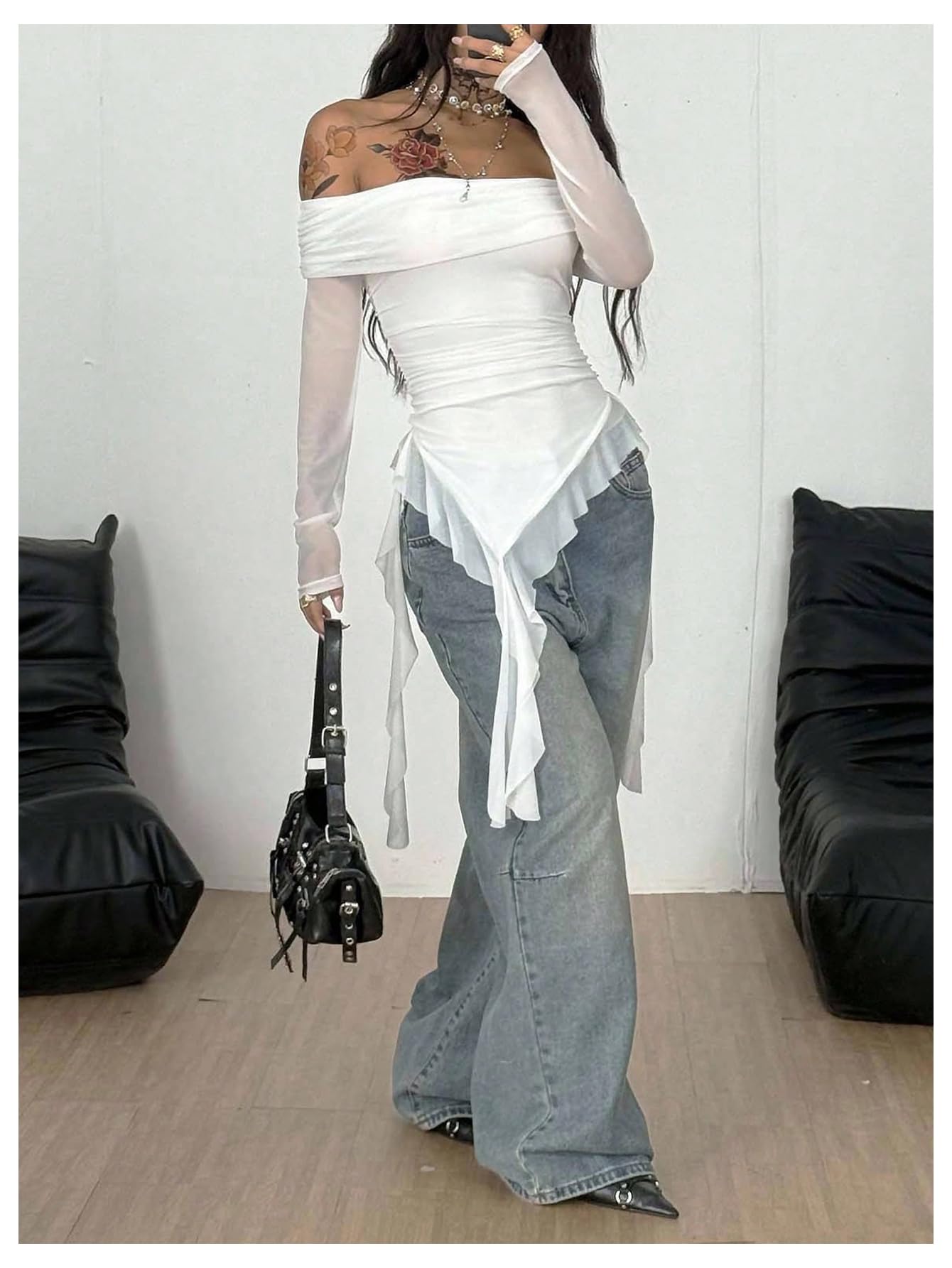 Whether you’re seeking a chic chic look or prefer a ethereal, elegant vibe, this top is a wardrobe styling enthusiast – the off-shoulder’s sexy allure, the mesh’s ethereal elegance, and the irregular, niche feel make it a versatile and versatile outfit.