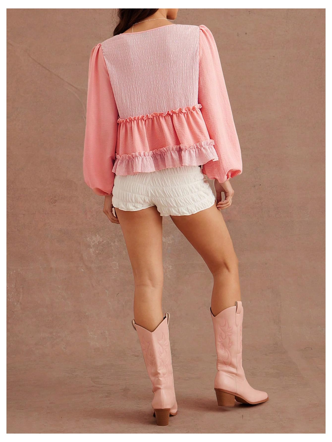 Whether you want to go the “pure girl” route or prefer the “light retro romantic” style, this pink ruffled top can become the “atmosphere” in your wardrobe. With a touch of peach pink, it brightens the sweet dollar atmosphere of all seasons.