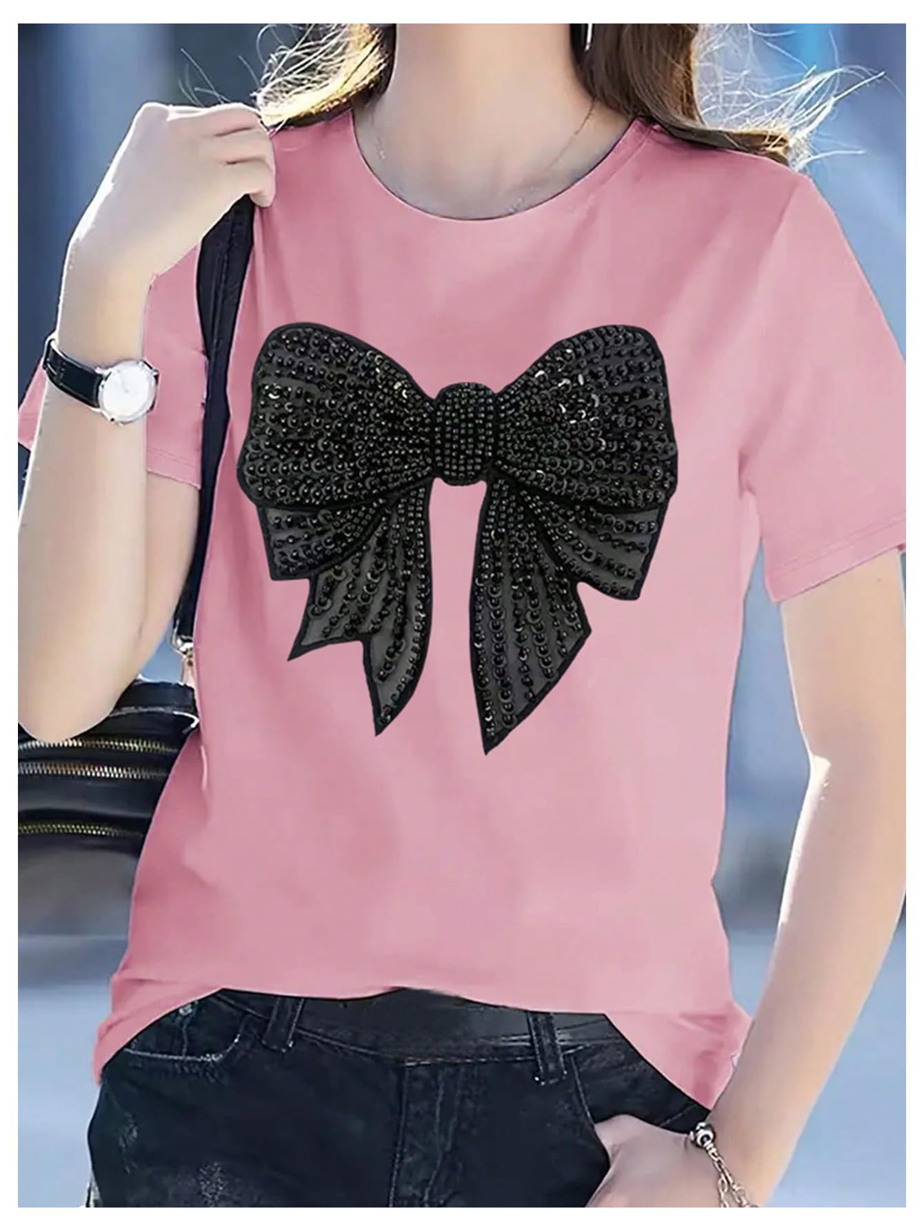 Luxurious Rhinestone Bow: A large black rhinestone bow adorns the chest, its bling-bling rhinestones shimmering in the light, evoking the couture dress bow woven into the T-shirt. This striking contrast with the soft pink base instantly elevates the look with a sweet, youthful energy and luxurious texture, transforming a basic T-shirt into an eye-catching statement piece.