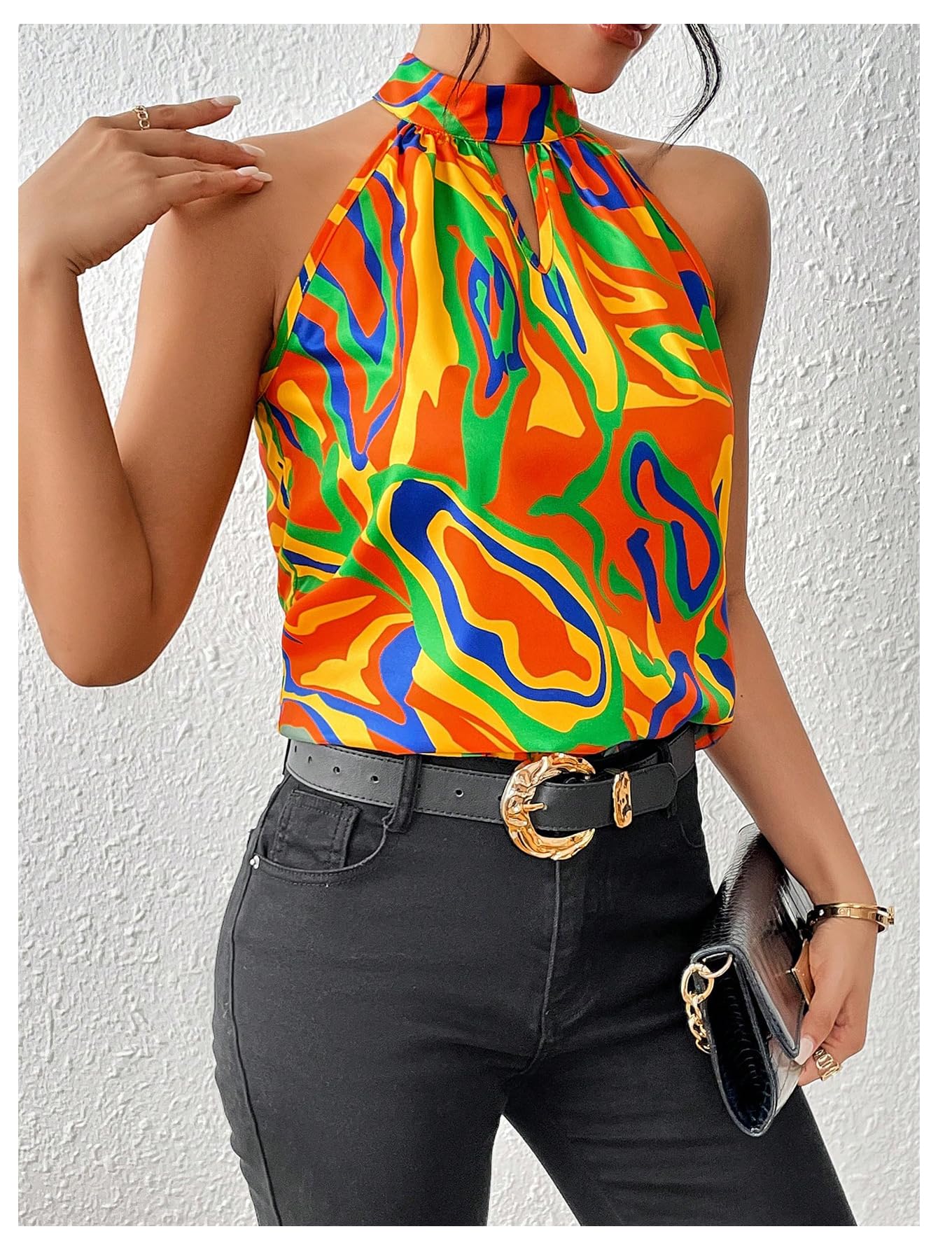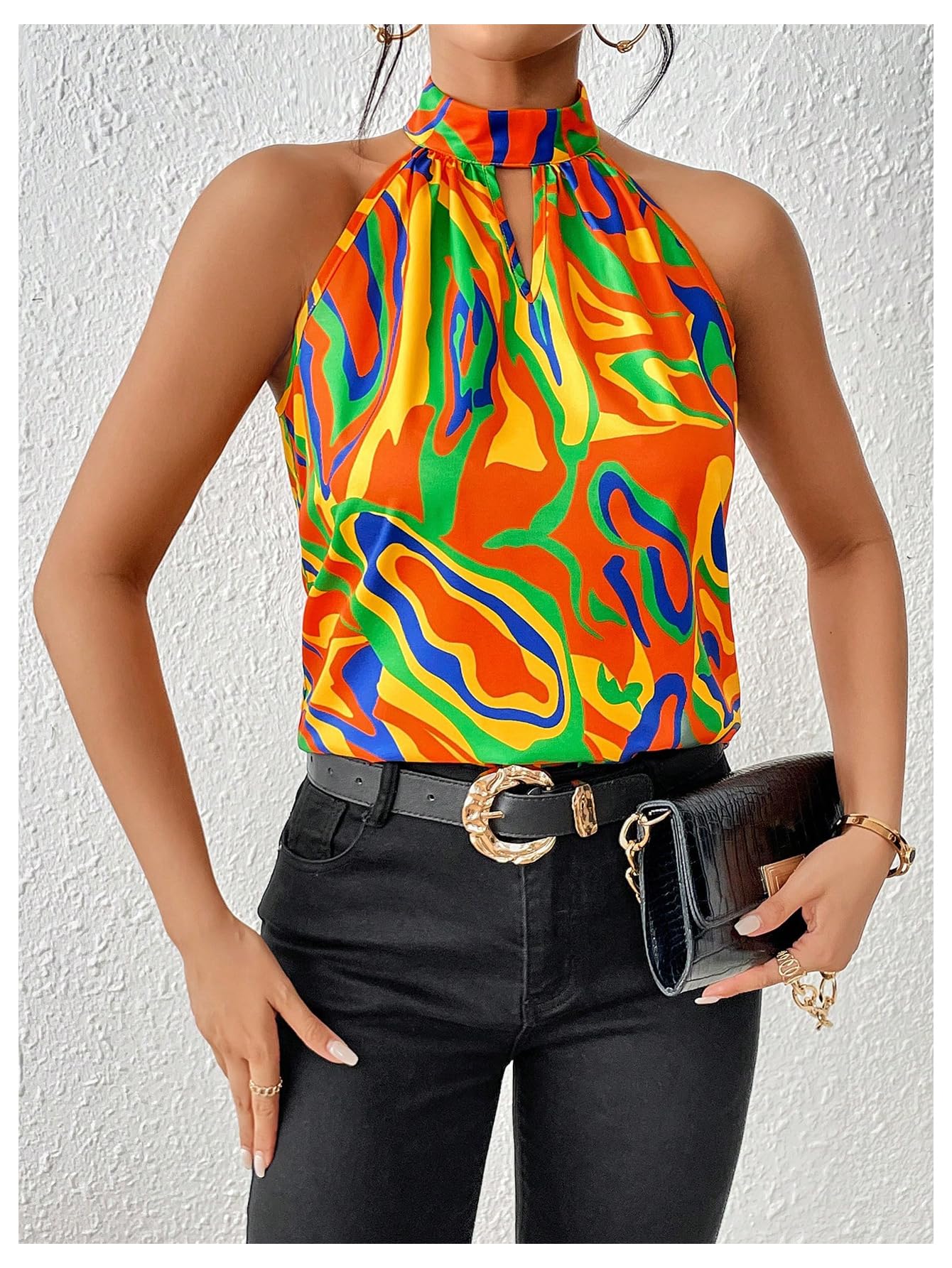 Whether you’re a retro lover or looking to add an arty touch to your wardrobe, this halterneck printed top is sure to be a wardrobe standout. Its contrasting colors, satin sheen, and retro silhouette make it a versatile and modern piece.